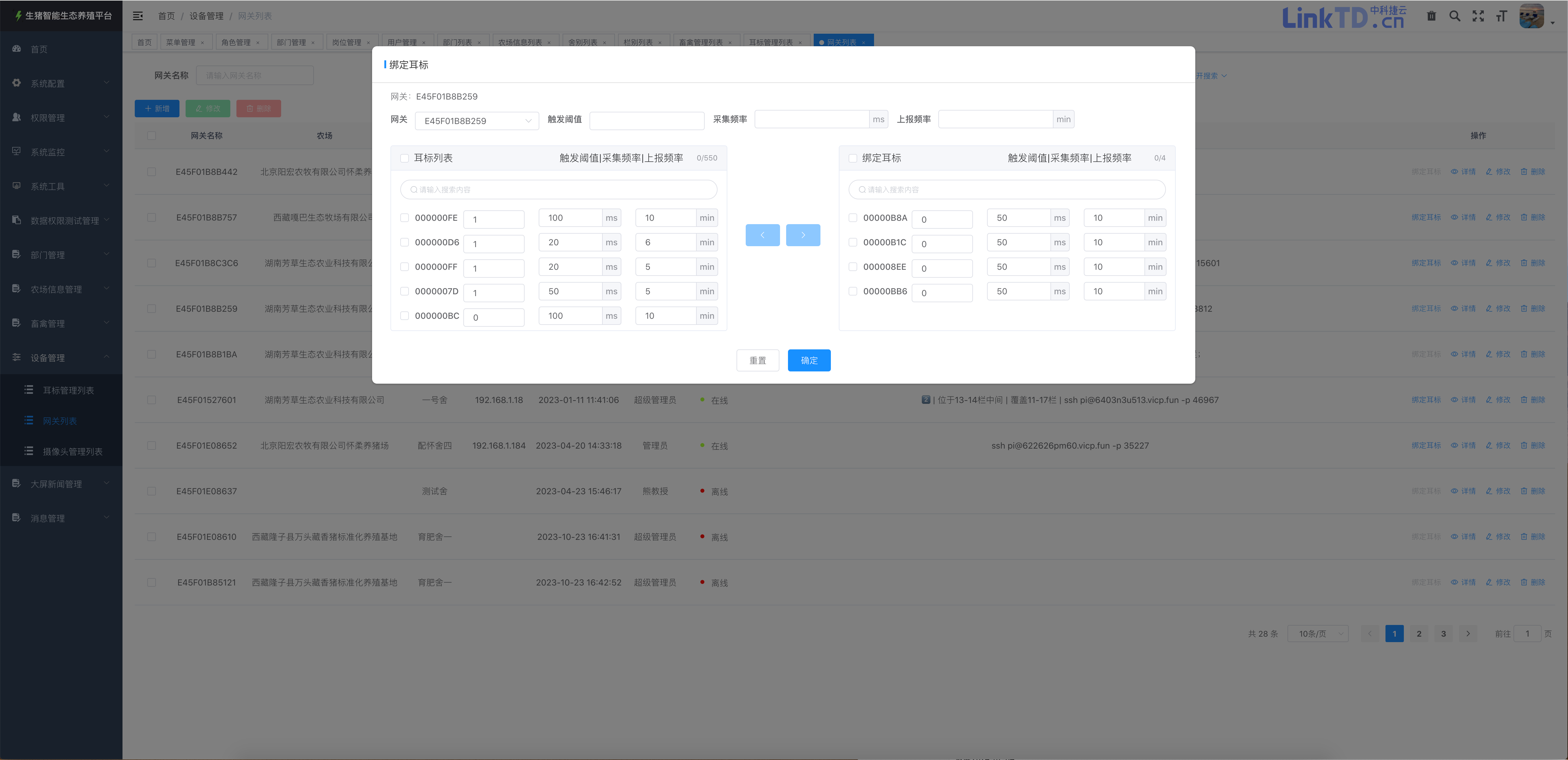 生猪智能生态养殖平台支持环境数据、视频监控数据的采集和展示,支持行为数据的采集、模型接入及展示;支持用户、养殖场、舍别、栏别管理,支持畜禽品种、日龄管理,支持网关与耳标绑定管理,支持耳标剩余电量显示,支持消息通知模板设定。