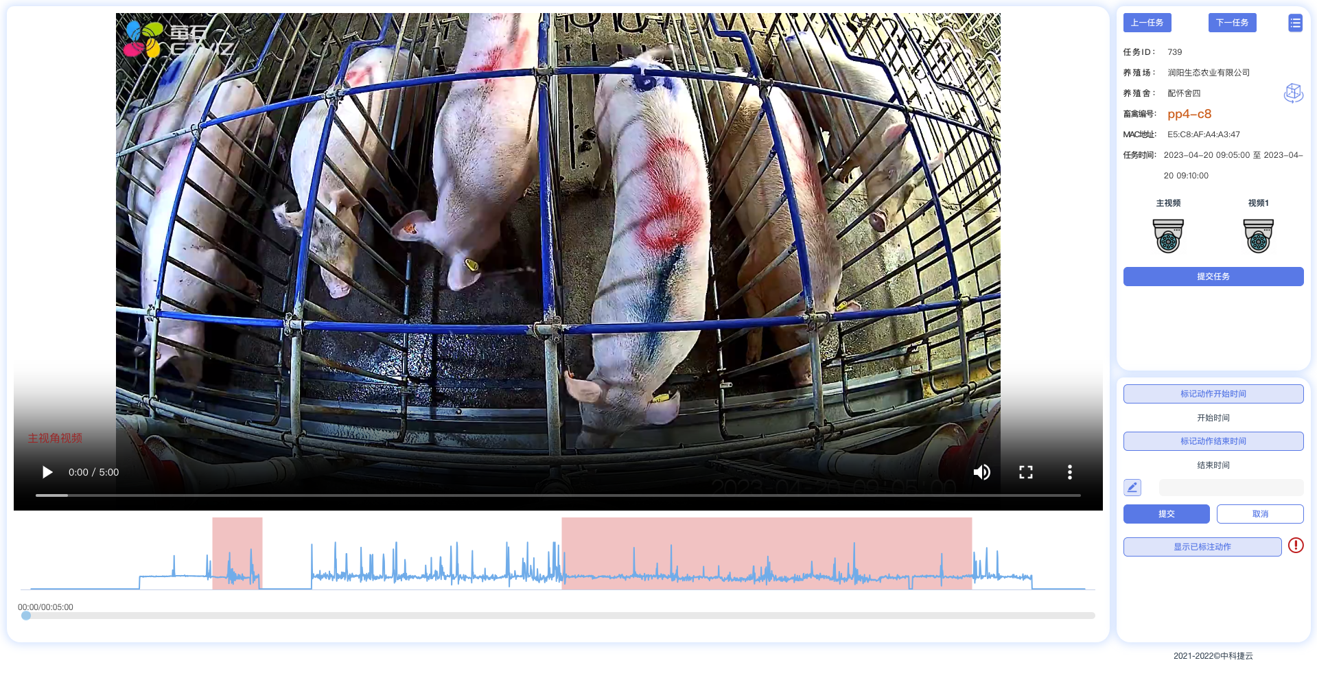 中科捷云生猪行为标注系统是基于SaaS云服务的生猪行为标注平台,支持根据视频图像对猪只行为进行标注,具备人员管理、任务管理、绩效考核功能。系统根据养殖行业专家指导可标注24种动作,可同屏显示2路视频以以从不同角度观察被标注对象,从而提高标注效率。