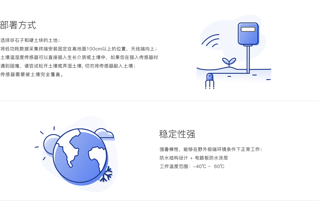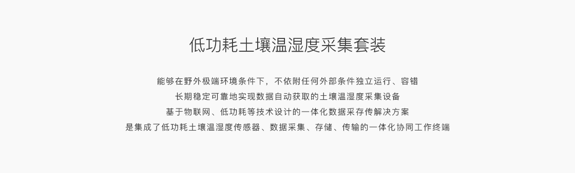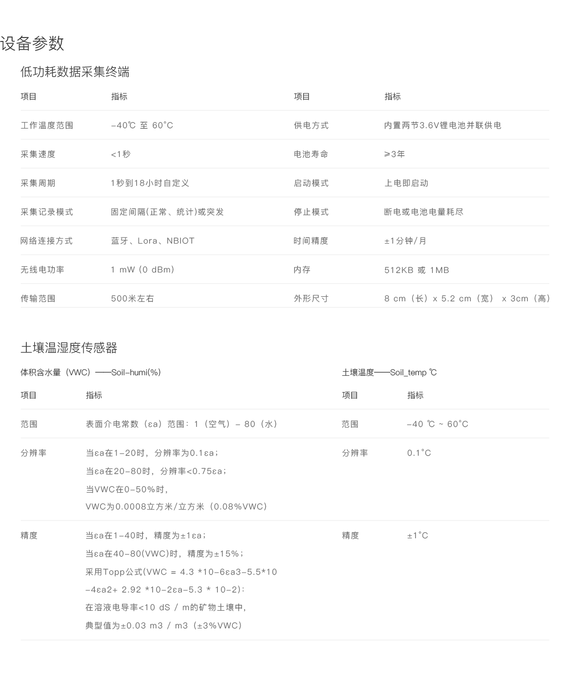 集土壤温湿度传感器于一体的低功耗数据采集终端,基于窄带物联协议方便、快速地采集、存储、传输数据,能在恶劣的户外环境中提供高精度的测量结果。