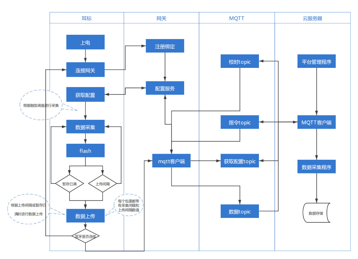生猪智能生态养殖平台数据采集层硬件部分由耳标和网关和摄像头、环境传感器组成,耳标将采集的数据通过蓝牙传输到网关,网关接收后通过MQTT上传给云端服务器。采集、存储流程如下图所示: